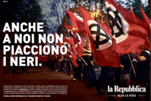 Non è una novità ma ora lo ammettono anche loro: Repubblica diventa da domani un giornale militante in ogni riga e servizio, nelle immagini, nella scelta dei servizi, nei commenti. Non che fino ad oggi non lo fosse, ma la mission veniva condotta con il vezzo salottiero della sinistra radical chic. Ora il giornale che non maschera più la sua intenzione di fare propaganda politica. Nuovo giornale e nuovo sito voluti dal direttore Carlo Verdelli debuttano domani e vengono promossi come un cambiamento radicale. Lo dimostra anche la pubblicità con la quale si sottolinea che Repubblica intende “prendere posizione e battersi per le proprie idee”. C’è in particolare una pagina pubblicitaria che dimostra quanto sopra affermato: bandiere con le croci celtiche accompagnate dalla scritta “Anche a noi non piacciono i neri”. Un modo per chiamare a raccolta i lettori antifascisti cui viene indicato il “nemico” di ieri e di sempre…